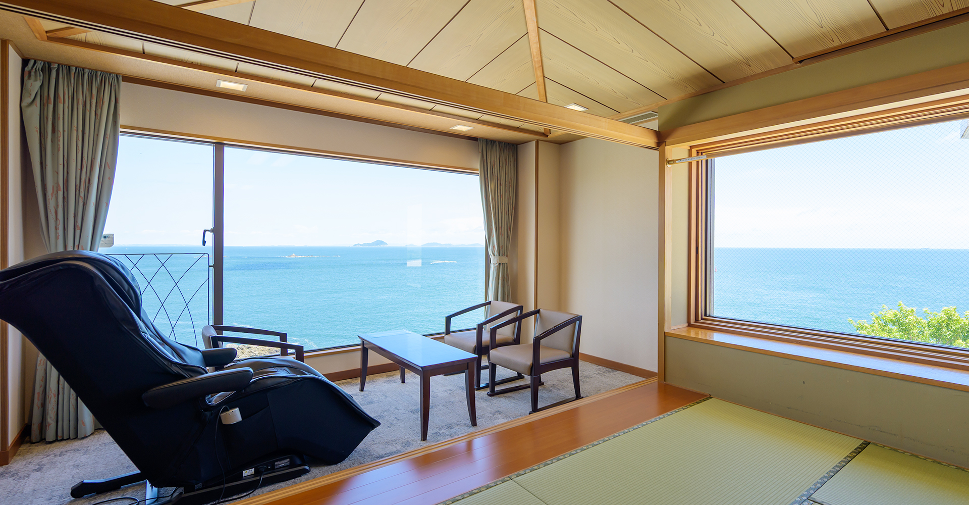 和の趣を大切にした和室、洗練された洋室――どのお部屋も開放感あふれるゆとりの設計。すべての客室に備えたマッサージチェアに身を委ね、波間に浮かぶ島々を眺めながら、心解きほぐれる贅沢なひとときを。