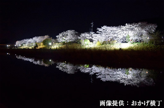日没以降は、五十鈴川河川敷周辺がライトアップされ、水面に桜が映る幻想的な風景をご覧いただけます。
