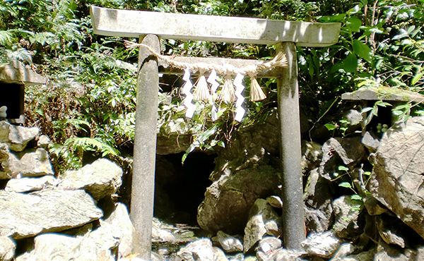岩の左下へ50m下ると(写真下)語り場があり、そこで大きな声で話しかけると岩の前にある鳥居の先の広場にいる方へは、岩が話しかけているように聞こえます。
